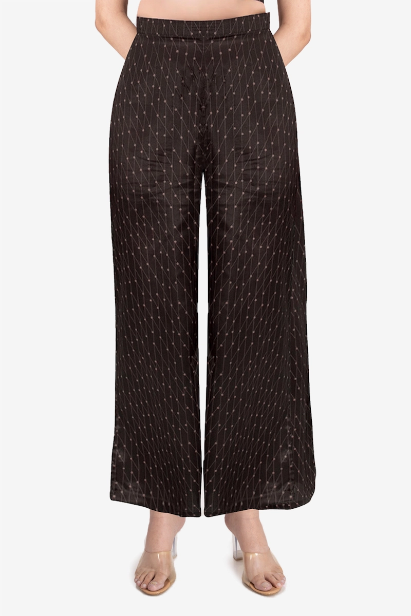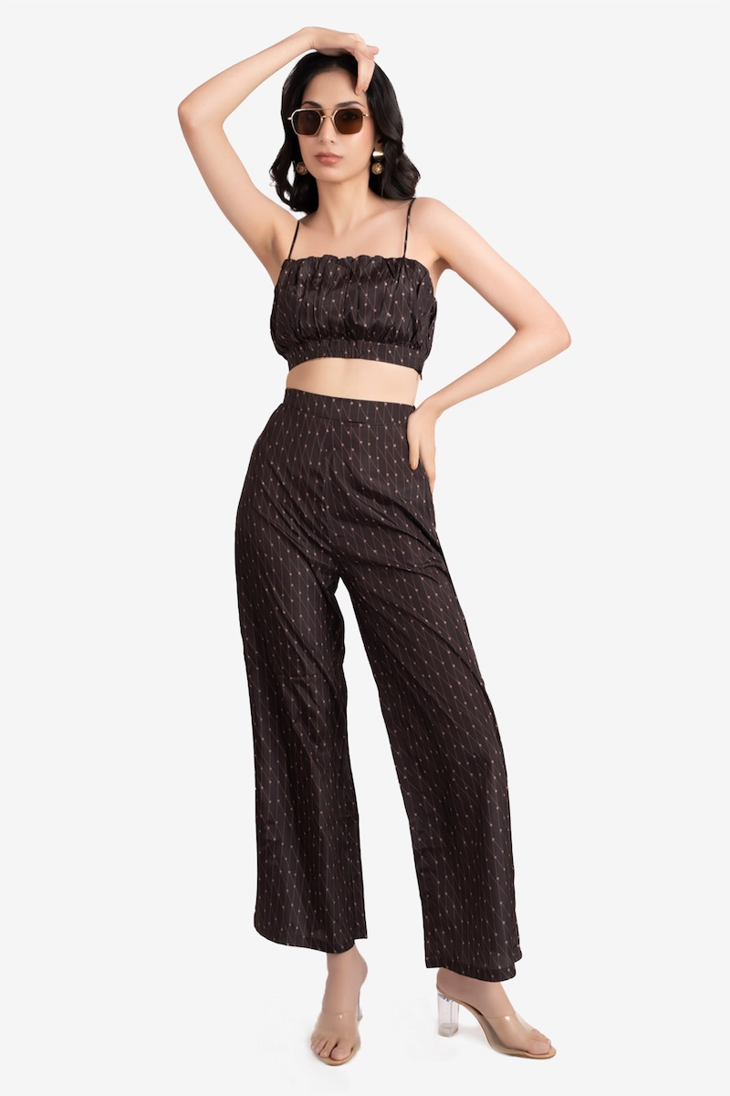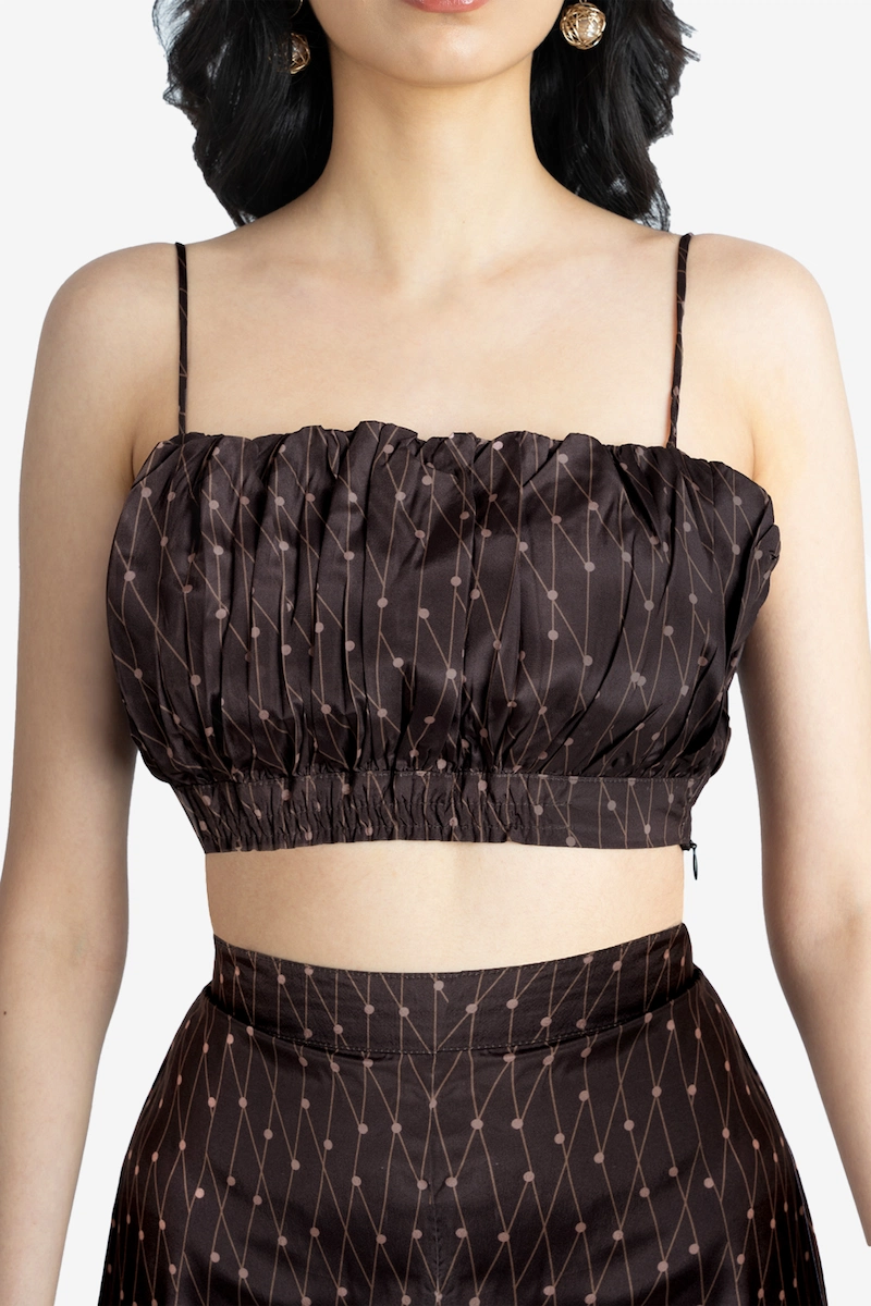 A gathered crop top paired with wide-leg pants in a dot-and-line print. Effortlessly transitions from stylish brunches to after-dark parties.