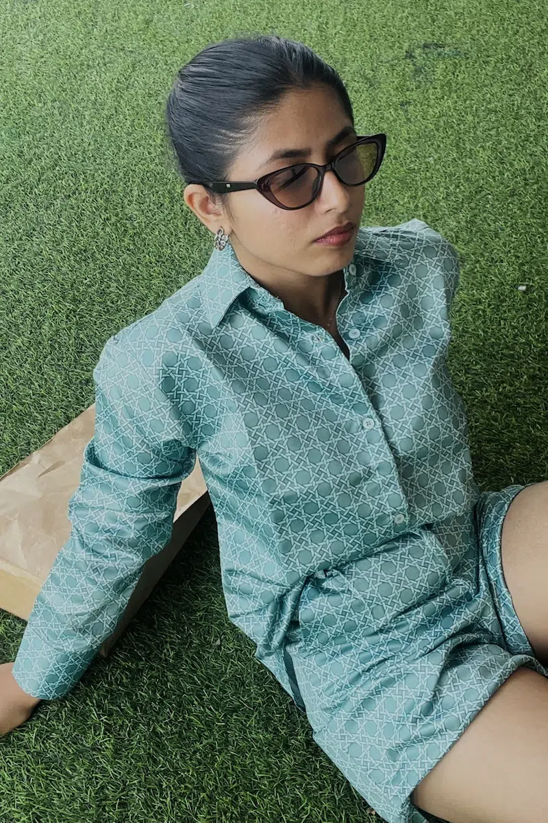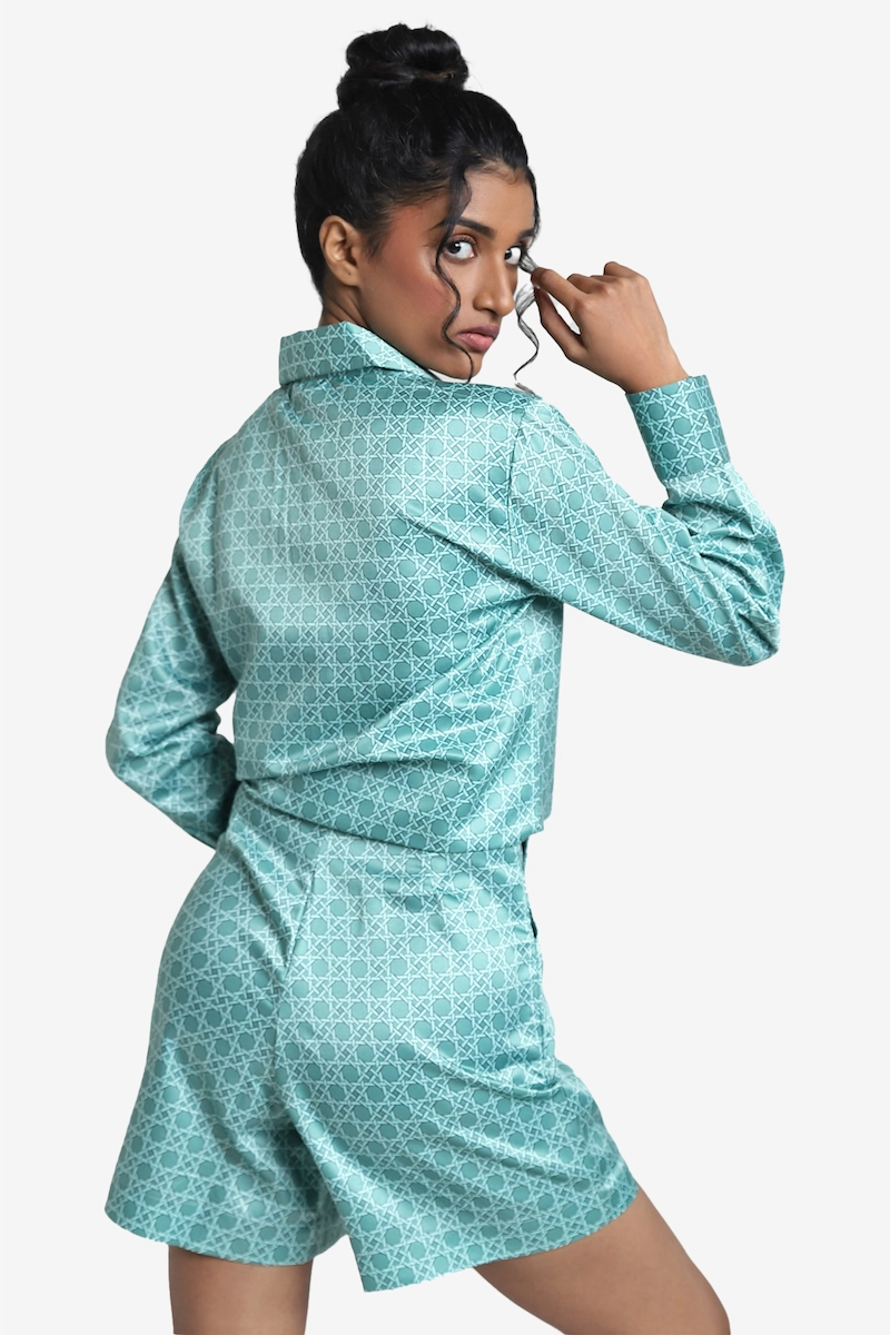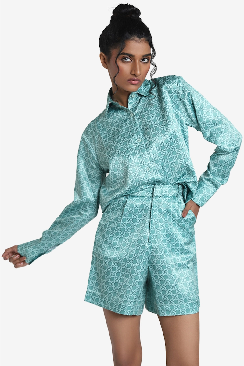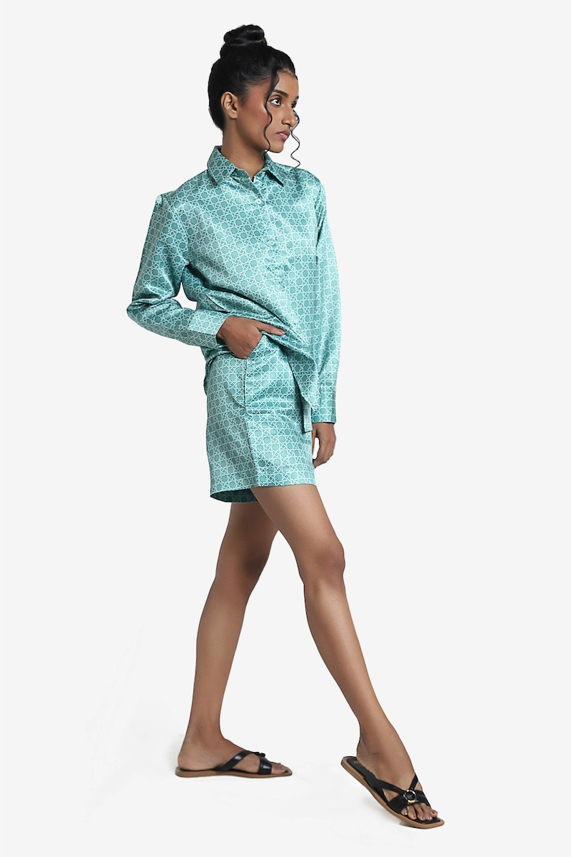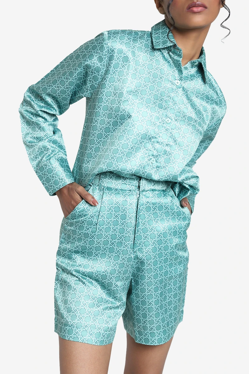 A lounge set with an oversized shirt and high-waisted shorts. Made for warm-weather getaways and luxe loungewear moments.