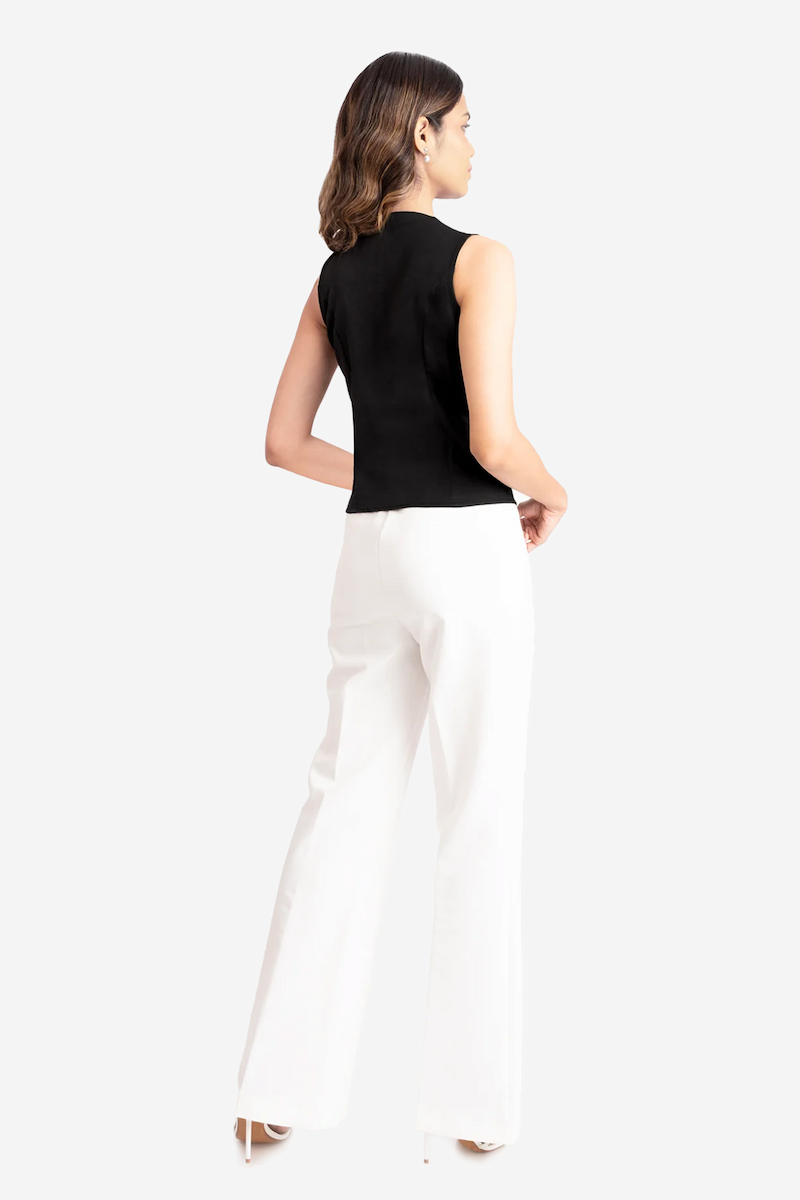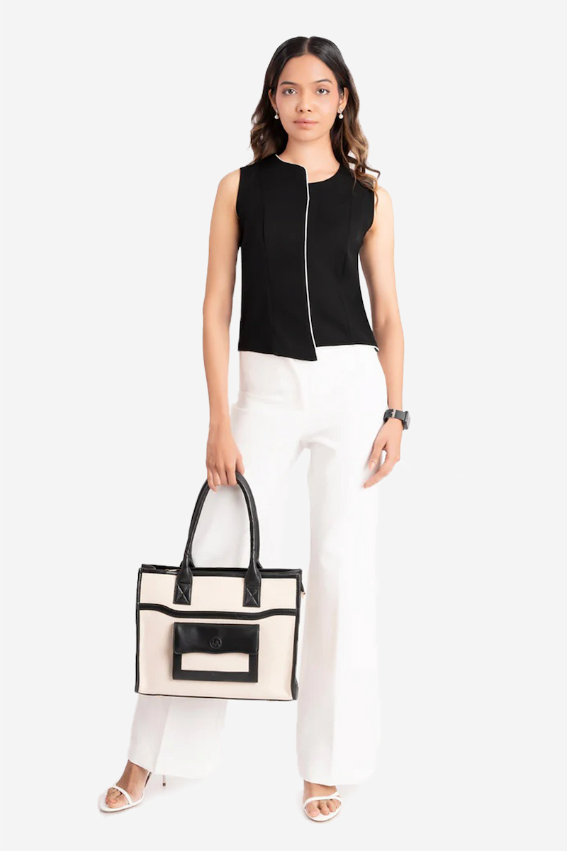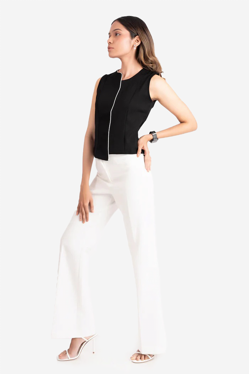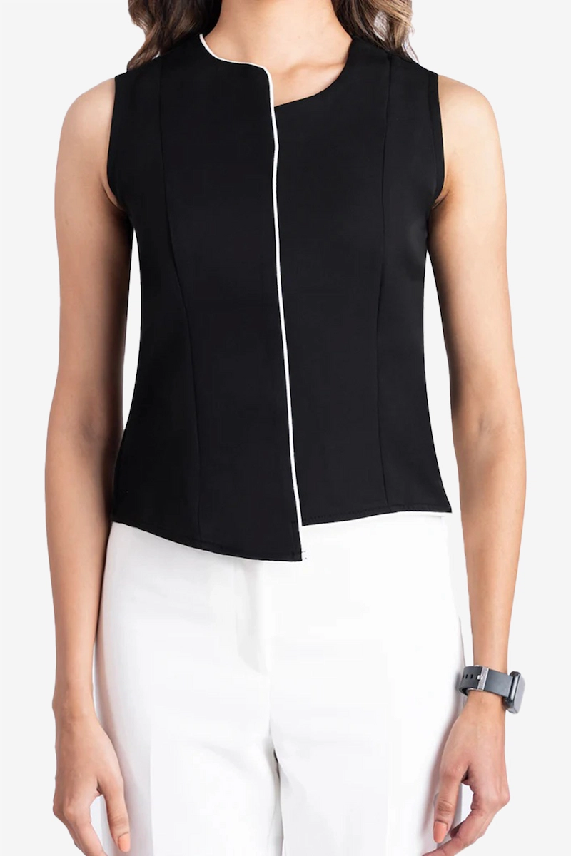 A sleeveless top featuring asymmetrical neckline and hemline, accentuated with white piping. Ideal for daily office wear.